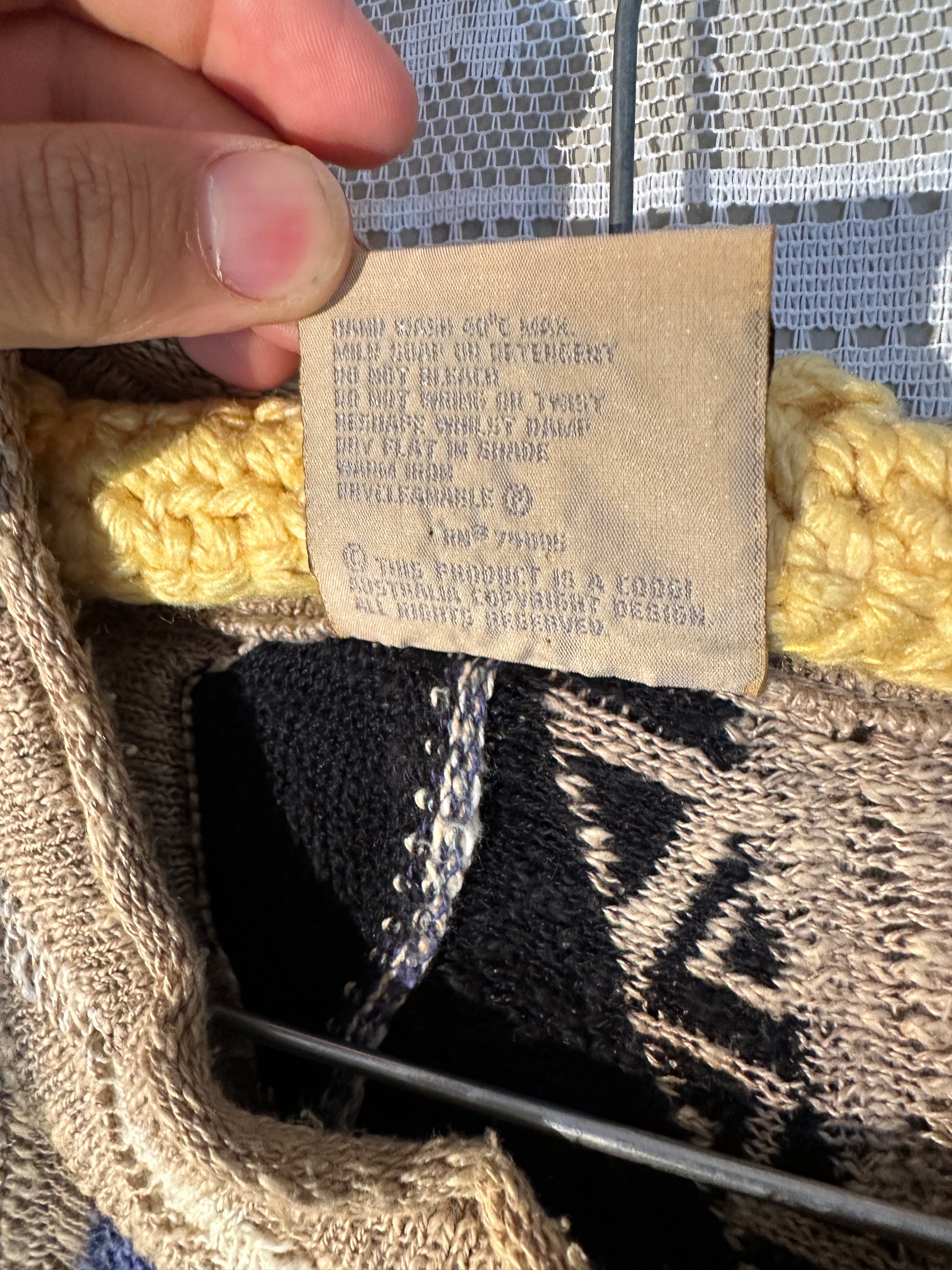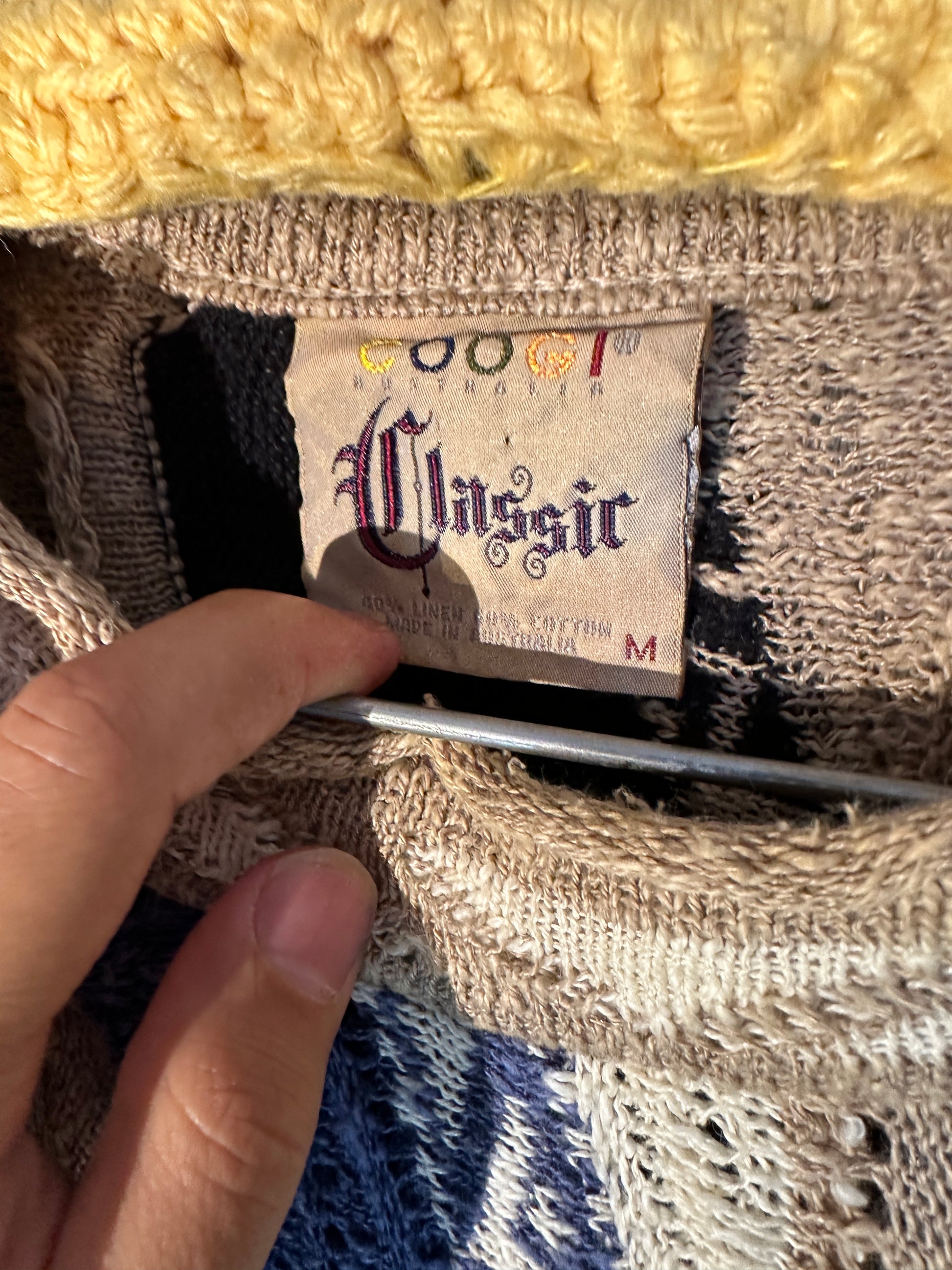 The COOGI Classic MEDIUM Textured Chunky Knit Sweater is a vintage-inspired piece made from a blend of linen and cotton, offering a comfortable and breathable fabric. Featuring a chunky-knit texture, crew neck, and long sleeves, this pullover sweater in a classic blue color embodies the 90s theme. Produced in Australia by the renowned brand COOGI, this sweater is a stylish choice for men looking to add a touch of retro flair to their wardrobe.