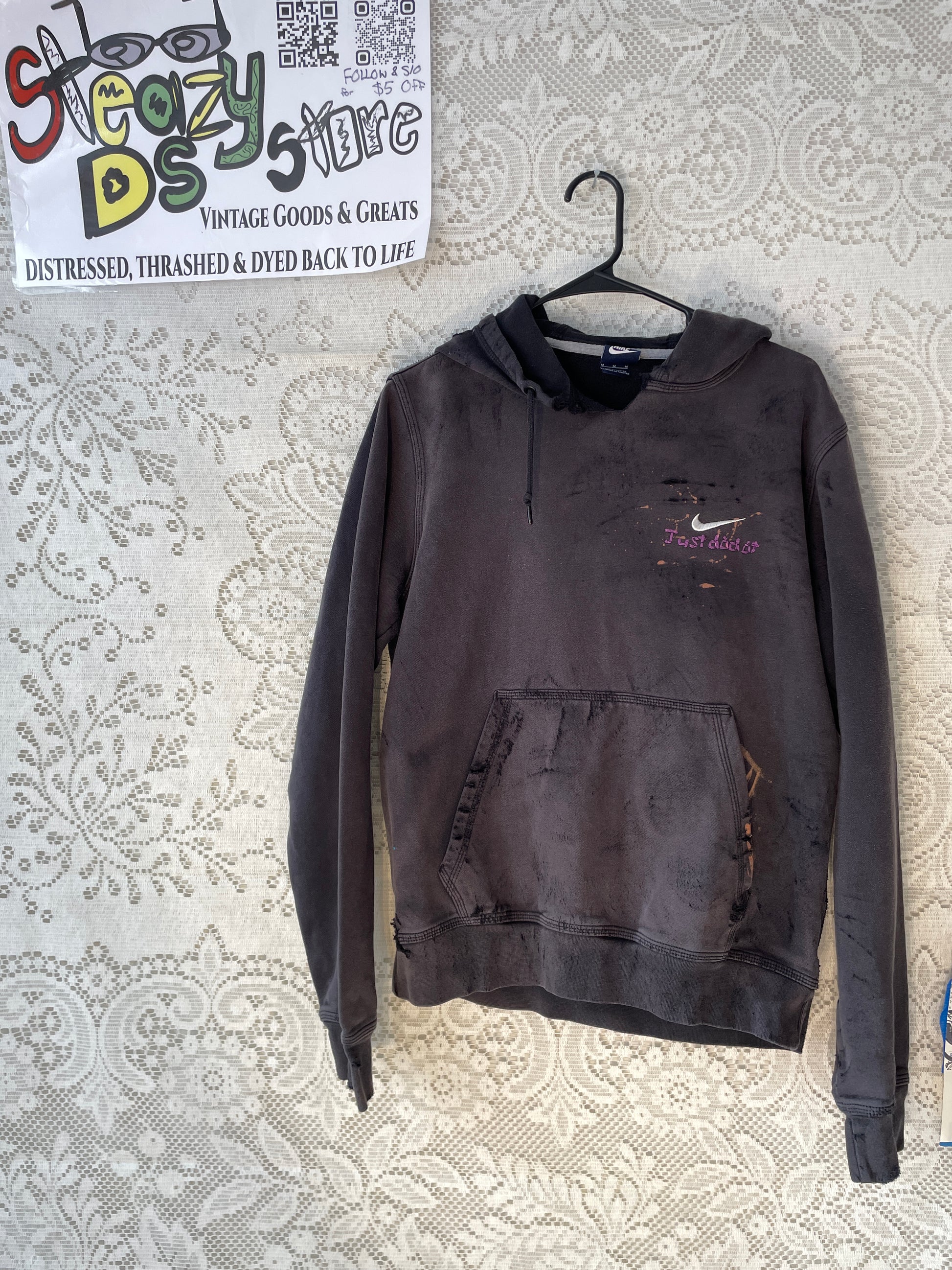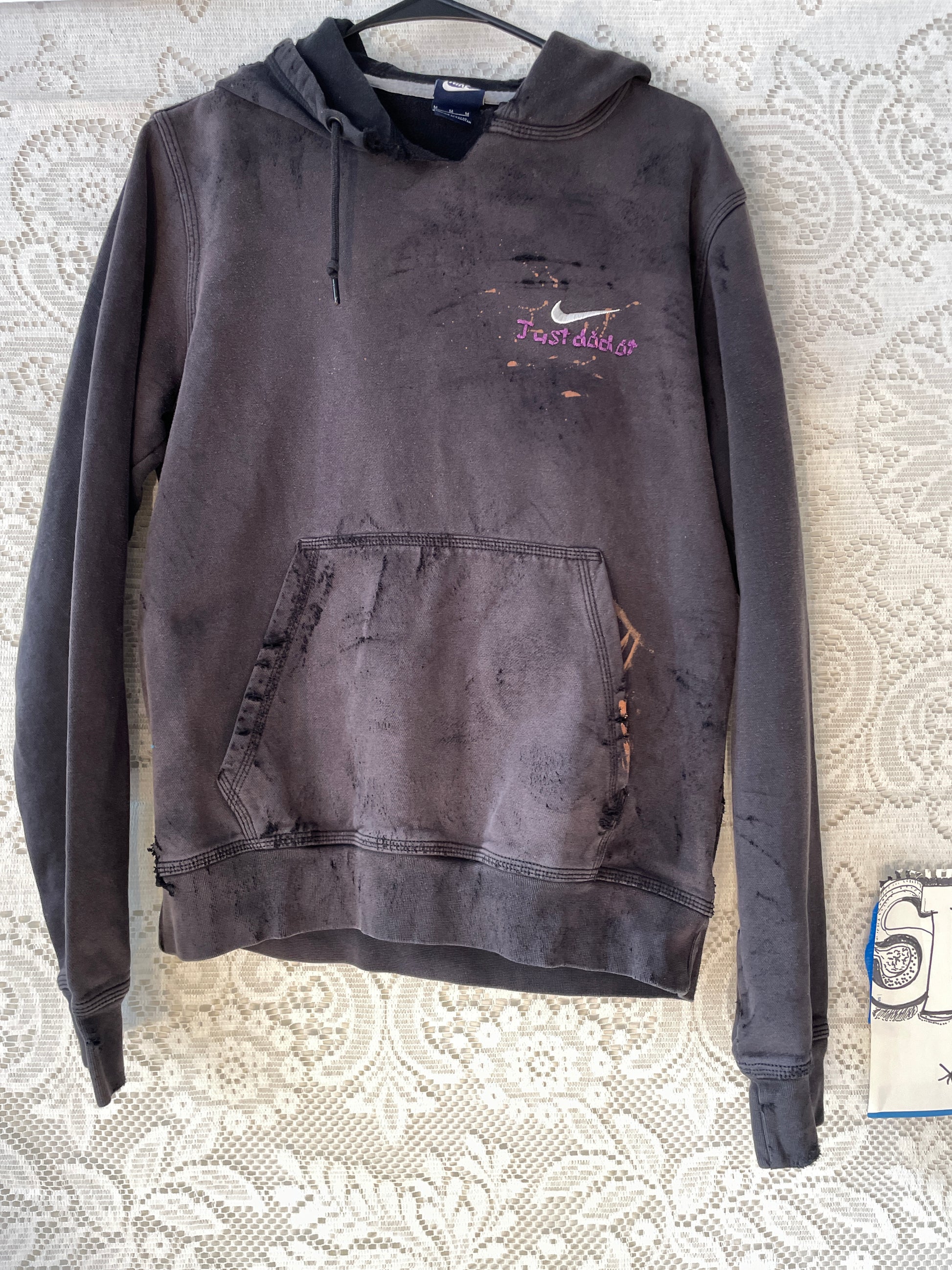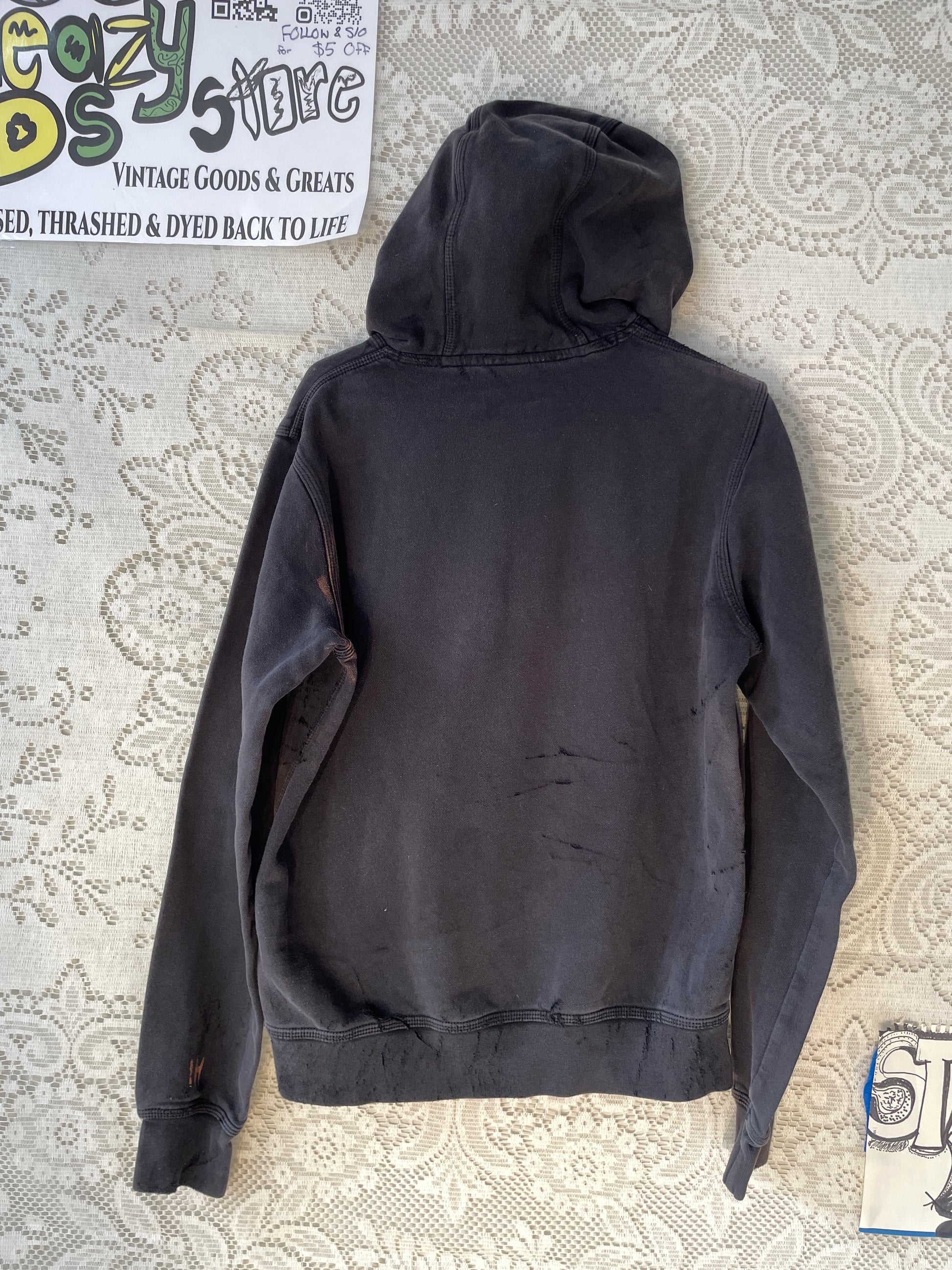 Nike Hoodie Small Black Embroidered Swoosh Logo Sun Dye Bleach Distress